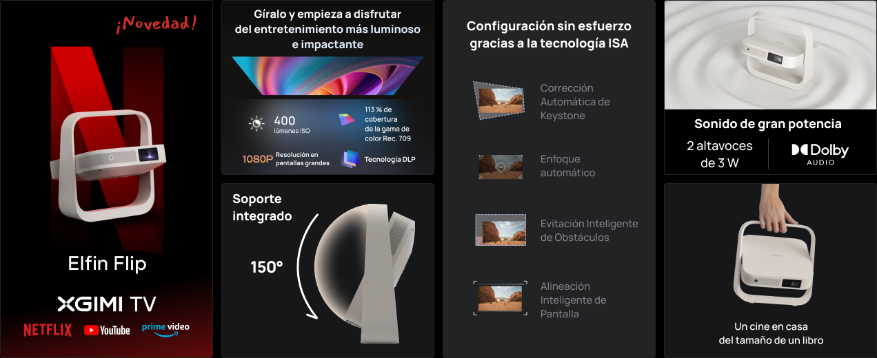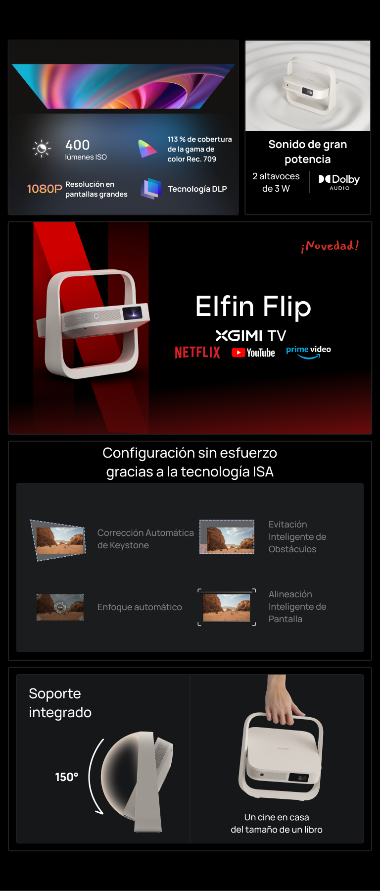 El Elfin Flip es el proyector portátil definitivo. Gracias a su tamaño, similar al de un libro, y a su diseño ultradelgado, cabe a la perfección en una mochila. Gíralo para disfrutar de tus series. Y cuando necesites llevártelo contigo, vuelve a girarlo para divertirte o trabajar en cualquier momento y lugar.