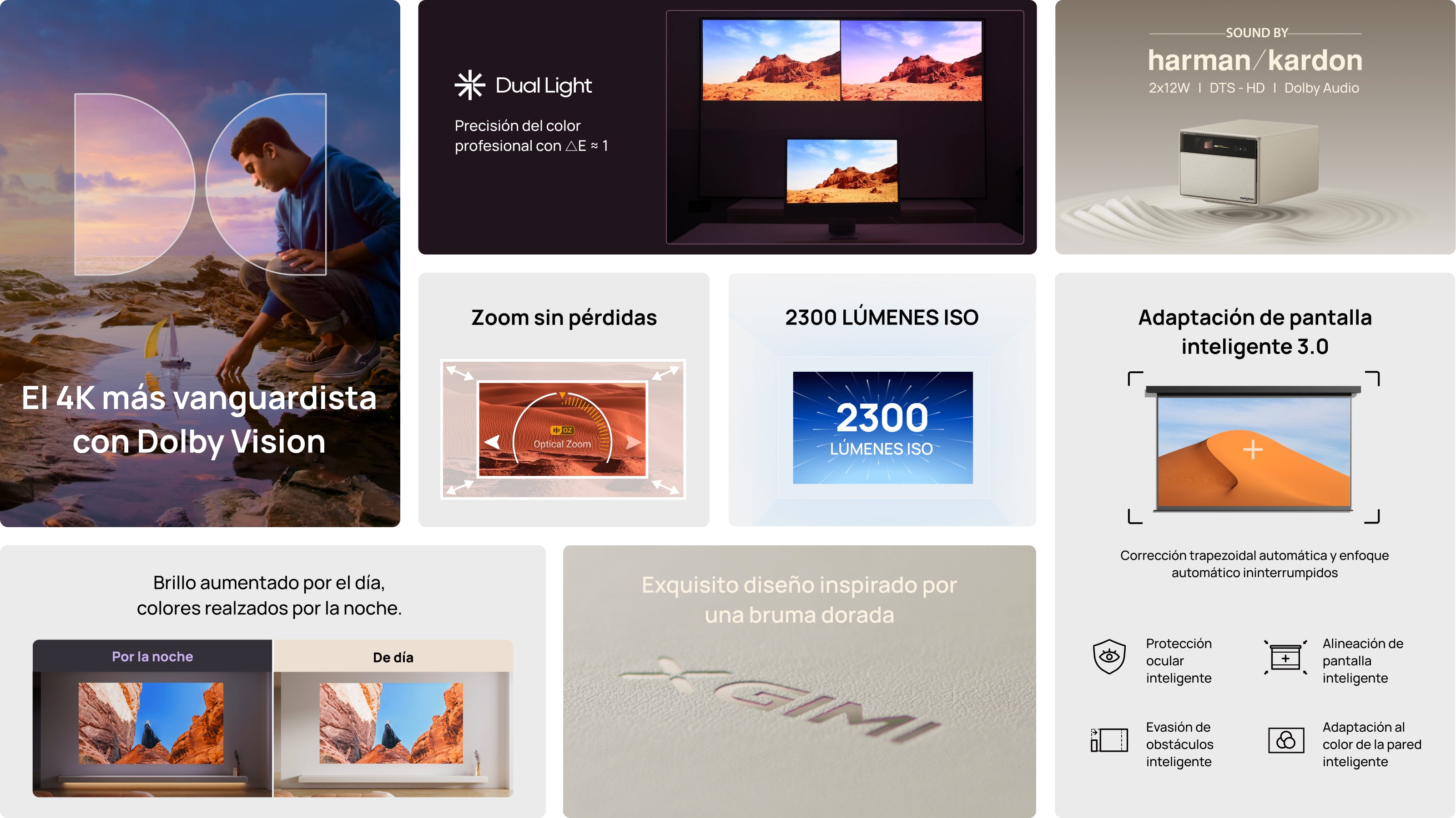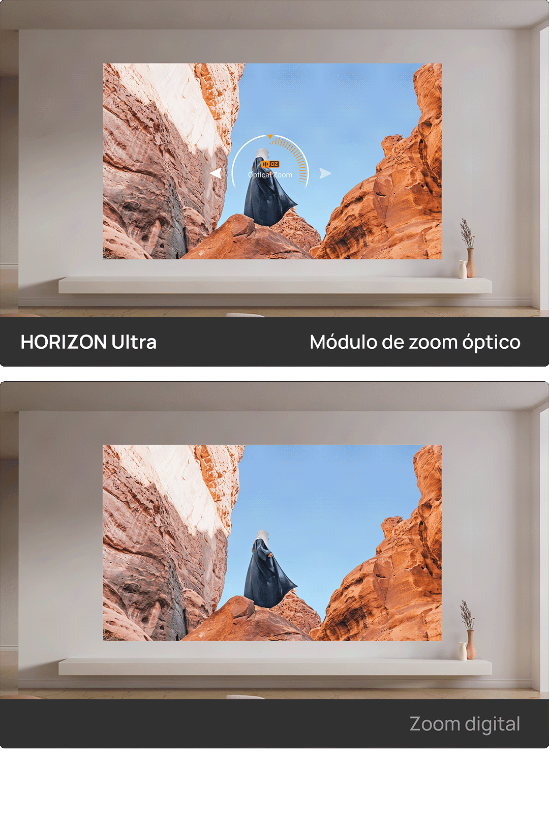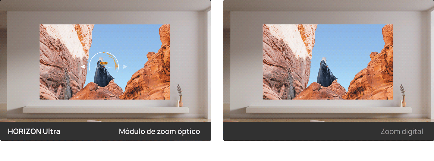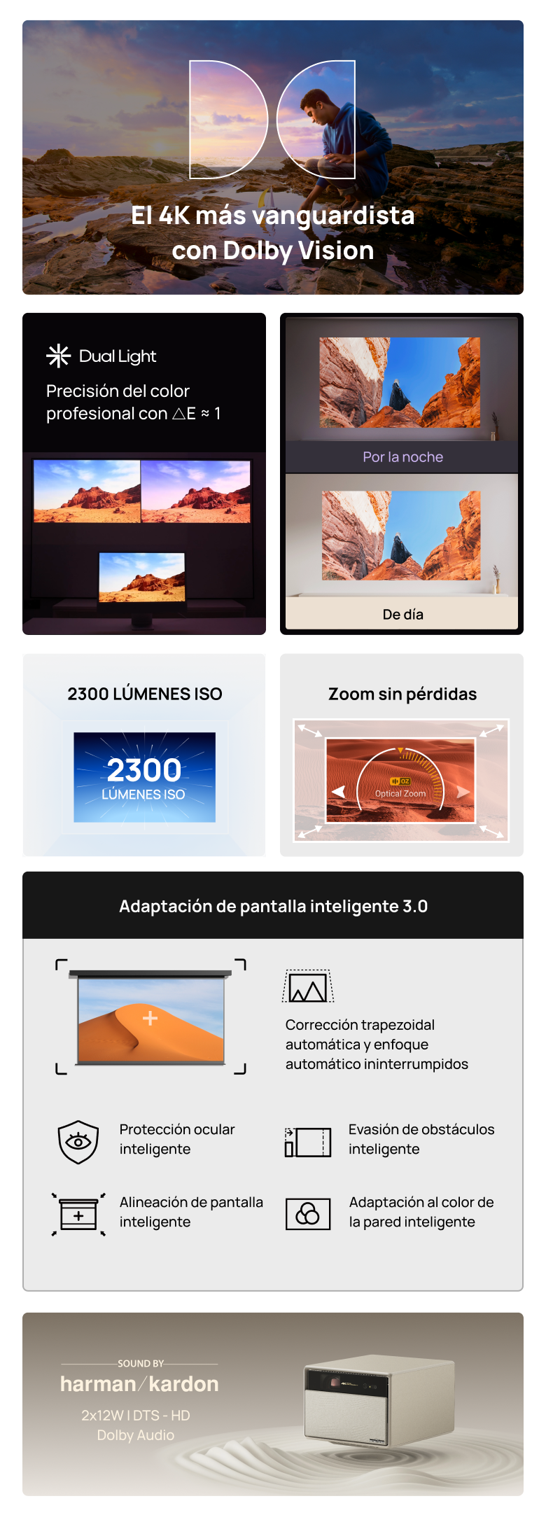 - Adaptación de pantalla inteligente 3.0: nuestra tecnología ISA actualizada optimiza la adaptación ambiental del proyector, permite un uso sencillo y ofrece funciones de ajuste al color de la pared y zoom óptico, entre otras.