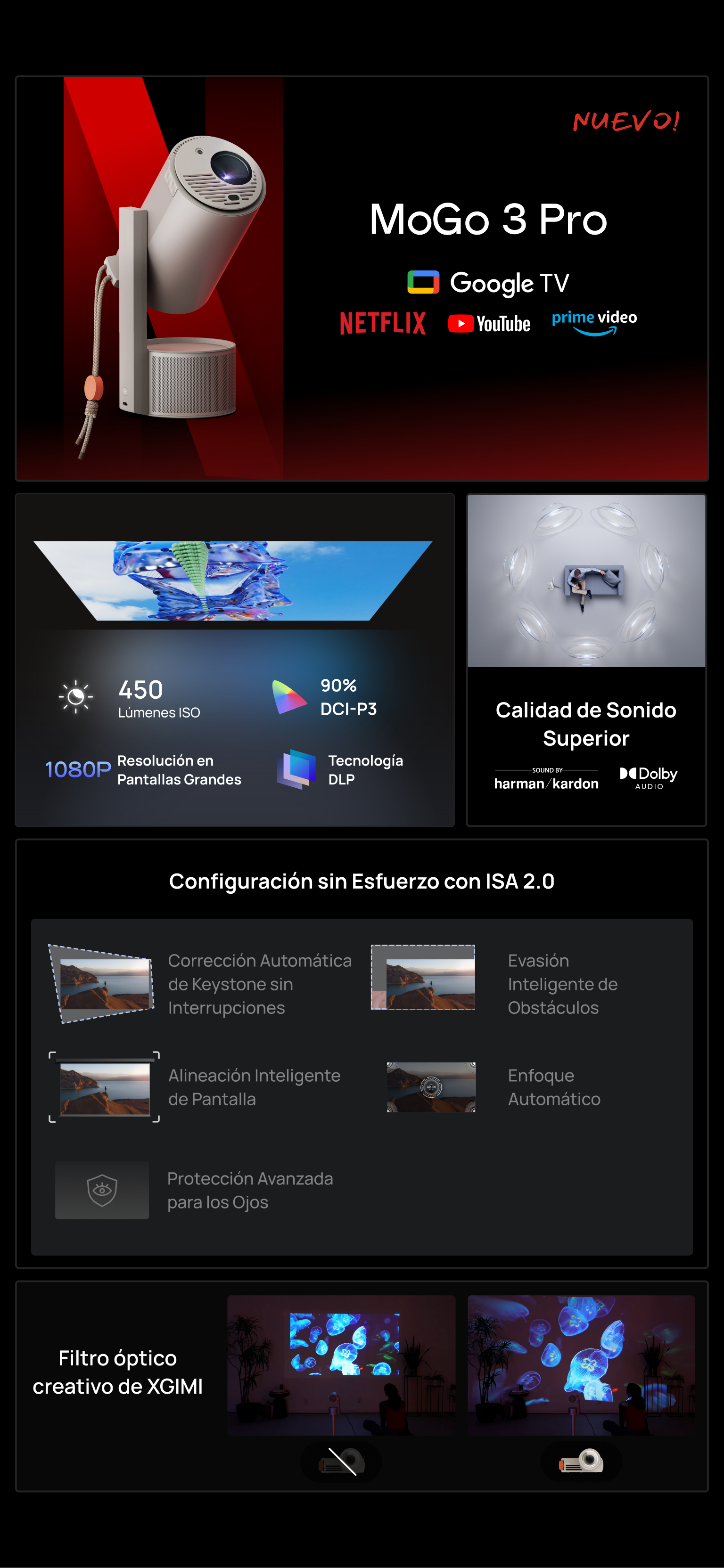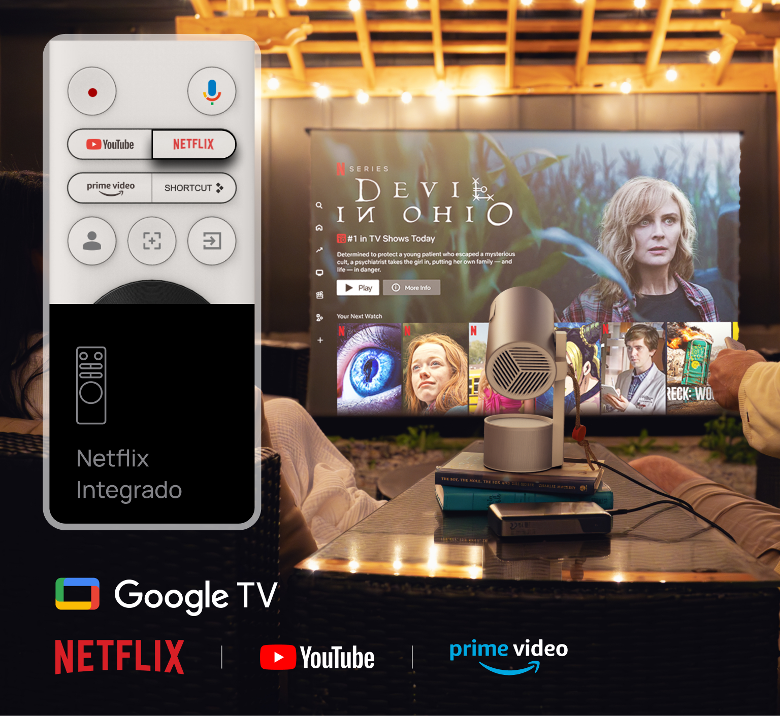 - Google TV con Netflix bajo licencia: Disfruta de los programas más populares y los éxitos de taquilla más recientes directamente en el MoGo 3 Pro. Sin complicaciones de instalación: ¡enciende y sintoniza! Accede a más de 10,000 aplicaciones y 800+ canales gratuitos. Solo sumérgete y disfruta.
