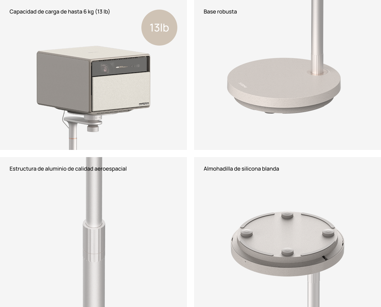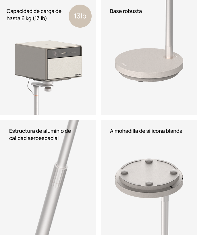 Cuenta con capacidad para soportar dispositivos de hasta 6 kg de peso. El diseño de aluminio de calidad aeroespacial utilizado y su robusta base garantizan una estabilidad excepcional y una durabilidad a largo plazo. Cuenta con una almohadilla de silicona suave en la parte inferior de la base para prevenir deslizamientos, absorber impactos y evitar arañazos en el suelo durante los movimientos.